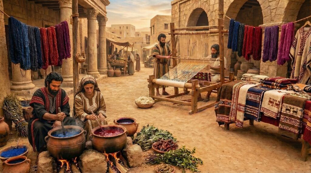 Blue dye was primarily obtained from the leaves of plants such as woad (Isatis tinctoria). For red shades, craftsmen used plants like safflower (Carthamus tinctorius), henna (Lawsonia alba), or madder (Rubia tinctoria). By skillfully using these plant resources, colors ranging from blue to reddish-purple could be produced, which matched those from sea mollusks and made Aramean textiles highly sought-after goods in the ancient world.