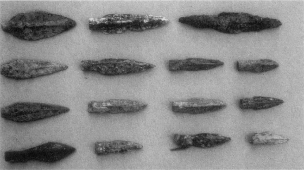 In total, the excavation uncovered at least thirteen individuals designated skeletons A and 1 through 12 as well as the remains of a horse. The skeletal material was primarily excavated in 1990 by Marianne Marek, with osteological analyses prepared by Dr. M. Domurad and subsequently by Dr. Ethne Barnes. The detailed osteological examinations reveal individuals ranging from a ten-month-old infant to a seasoned warrior of approximately 35 to 40 years of age. Skeleton 1 is an adult male, 30 to 35 years old and 174 cm tall, who was found sprawled face downward with six broken ribs, a damaged right arm, and broken fingers; the habitual kneeling stress in his right elbow and the ball of his left foot indicate that he was an archer. Skeleton 2 is a pre-adolescent male, only 12 to 13 years of age and small for his size, with knife wounds above the eye and a fractured skull. Skeleton 3, an adult male 22 to 24 years old and 180 cm tall, had a fragmentary socketed iron spear beneath him and a bronze trilobate arrowhead next to his femur; lumbar lesions were attributed to brucellosis, a bacterial infection derived from goat milk products. Skeleton 4 was a pre-adolescent 11 to 12 years old, tall for his age, with a copper or bronze earring near the left ear and a bronze trilobate arrow embedded in his left fibula; a total of six arrowheads were found in the vicinity of this single individual. Skeleton 5, an adult male 35 to 40 years old and 172 cm tall, was possibly the oldest individual at the gate, with arthritis, periodontal disease, stab wounds in the back and through the lower right ribcage, and both legs fractured as well as numerous old, healed injuries indicating that he was a seasoned warrior. Skeleton 6, an adolescent male 17 to 18 years old, carried beneath his body a fine translucent pale-blue chalcedony conoid stamp seal with an attached bronze elbow fibula; a silver earring in the form of an inverted crescent suspended below a disc lay beneath the left wrist. Skeleton 7, an adult male 35 years old and 168 cm tall, was found face down on the pavement with cut marks on the left side of the skull, stress patterns indicating he too was an archer, and several old, healed wounds. Skeletons 8 through 11 represent a cluster of younger people found toward the rear of the entrance passage: a child 7 to 8 years old whose back appears to have been broken, with a silver earring near the right ear; an 11 to 12-year-old whose arms were burnt by falling debris; an infant of just ten months; and a child of three years the two youngest to die in the Halzi Gate conflagration. Skeleton 12, an adult male 27 to 30 years old and 166 cm tall, had cuts in the skull and a penetrating wound through the lower right abdomen caused by a blunt weapon; stress injuries of the right shoulder and hand suggest military duty.
