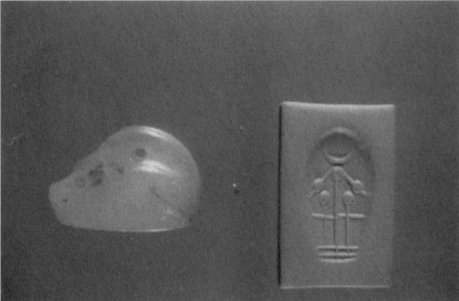 The weaponry scattered among the dead included twenty bronze arrowheads (bifacial, transitional-trilobate, and trilobate types), a lancehead, and iron spears. Personal possessions recovered from the gate area were equally telling: a composite necklace containing a white steatite scarab dated to the Egyptian twenty-sixth dynasty (664–525 B.C.), a cowrie shell modified for threading, twenty carnelian and four lapis lazuli beads, bronze tweezers, bronze fibulae, silver and copper earrings, a bronze bangle, bone tubes, and multiple stamp seals. The excavator concluded that "socially privileged individuals were amongst the dead." Among the seals, a duck-shaped green chalcedony stamp seal from the outer entrance passage bears the design of a stylized moon standard, reflecting, in the excavator's own assessment, "the importance of the god Sin of Harran at Nineveh." This detail is significant: the cult of Sin at Harran was closely associated with the Aramean population of the region, and Harran itself was a major center of Aramean culture and religion. The fine pale-blue chalcedony seal found beneath skeleton 6 was engraved with both Babylonian and Assyrian deities, the Mushhushshu dragon of Marduk and Nabu on its base, and the moon-god Sin on its side, illustrating the religious syncretism that characterized the cosmopolitan population of late Assyrian Nineveh.
