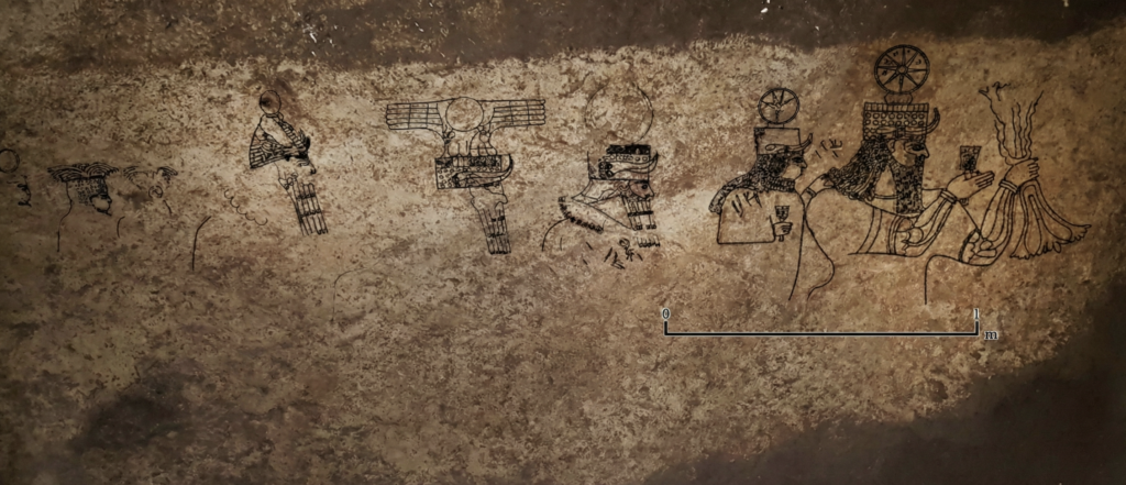The importance of Sîn of Harran as an Aramean deity in this region is supported by the 2018 discovery at Başbük near Siverek in southeastern Turkey. Excavations revealed a rock-cut sanctuary with a 3.96-meter wall panel depicting eight deities, all labeled in Aramaic rather than Akkadian cuneiform, and notably excluding the Assyrian god Ashur. The panel follows an Aramean religious order, with Hadad as the supreme deity, a role that would have belonged to Ashur in an Assyrian context. All divine names are written in their Aramaic forms, with no Assyrian spellings. The panel has therefore been identified as Aramean, and the absence of Assyrian elements such as the god Ashur and Akkadian labeling makes an Assyrian attribution highly unlikely. Among the procession appears Sîn, the Moon God of Harran, identified by a crescent and full moon crown. This is significant for the Halzi Gate finds, as the moon standard of Sîn appearing on a personal seal among the dead is consistent with an Aramean cultural context.