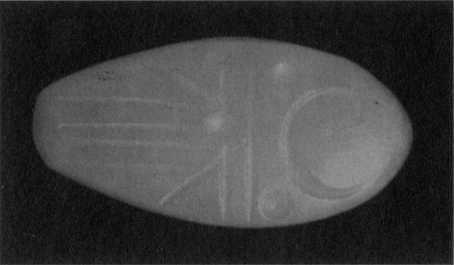 The weaponry scattered among the dead included twenty bronze arrowheads (bifacial, transitional-trilobate, and trilobate types), a lancehead, and iron spears. Personal possessions recovered from the gate area were equally telling: a composite necklace containing a white steatite scarab dated to the Egyptian twenty-sixth dynasty (664–525 B.C.), a cowrie shell modified for threading, twenty carnelian and four lapis lazuli beads, bronze tweezers, bronze fibulae, silver and copper earrings, a bronze bangle, bone tubes, and multiple stamp seals. The excavator concluded that "socially privileged individuals were amongst the dead." Among the seals, a duck-shaped green chalcedony stamp seal from the outer entrance passage bears the design of a stylized moon standard, reflecting, in the excavator's own assessment, "the importance of the god Sin of Harran at Nineveh." This detail is significant: the cult of Sin at Harran was closely associated with the Aramean population of the region, and Harran itself was a major center of Aramean culture and religion. The fine pale-blue chalcedony seal found beneath skeleton 6 was engraved with both Babylonian and Assyrian deities, the Mushhushshu dragon of Marduk and Nabu on its base, and the moon-god Sin on its side, illustrating the religious syncretism that characterized the cosmopolitan population of late Assyrian Nineveh.