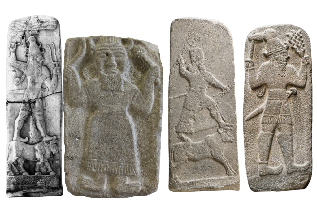 In his iconography, he is depicted holding a thunderbolt in his right hand and a bundle of lightning in his left. This corresponds with the epithet 'rammānu' (Thunderer), which appears in several ancient Near Eastern inscriptions and is also found in the Old Testament (2 Kings 5:18; Zechariah 12:11). Some depictions of Hadad include a bull that he rides. However, the bull is actually found in later images and was very likely added due to the influence of the ancient babylonians or other religions. Later on, images also began to give Hadad a female companion or consort. Goddesses such as Kubaba, Ishtar, Astarte, Anahid, Schuwala, Anat and later Atargatis were introduced, which was primarily a result of Phoenician, Assyrian, Anatolian and Egyptian influence. In antiquity, faith was not necessarily bound to a single nation but developed regionally, which is why other nations, such as the Assyrians, also erected statues of Hadad