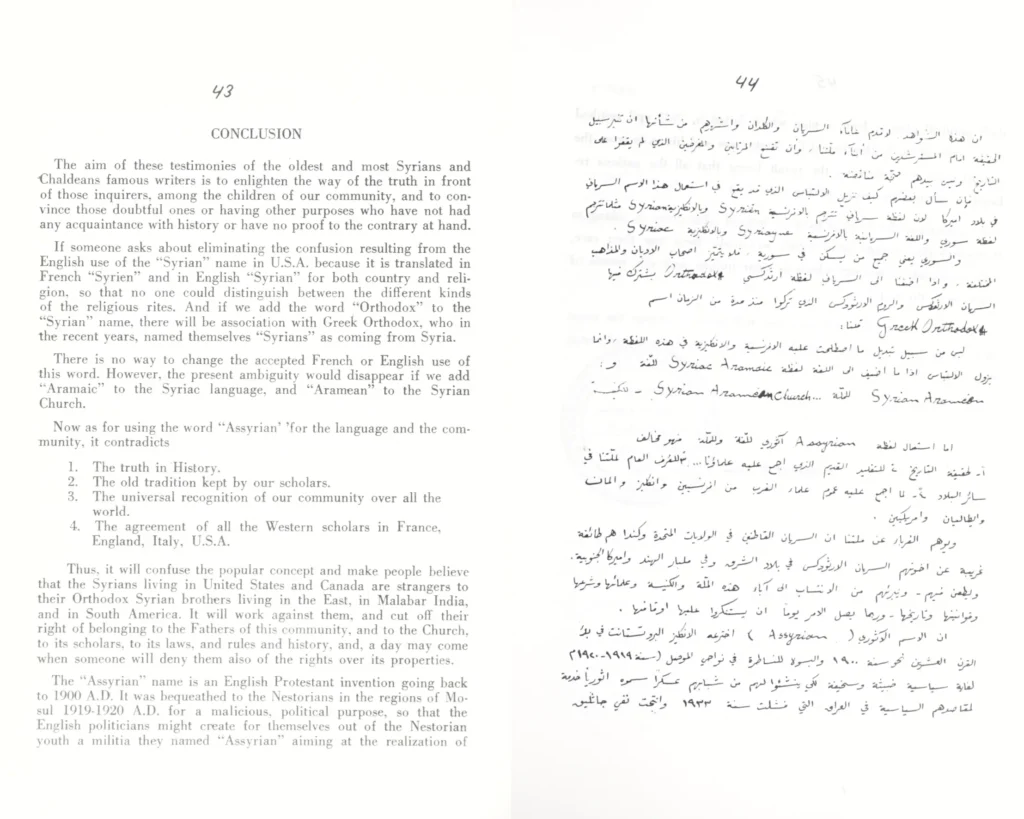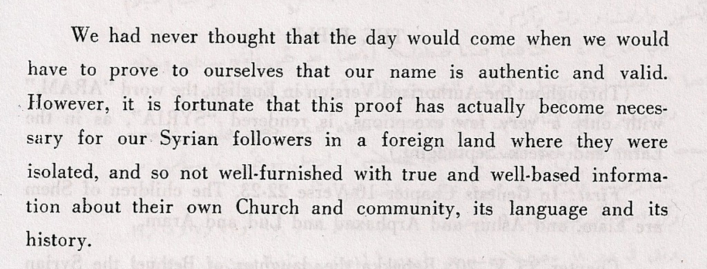 The definitive scholarly case came in late 1952, when Patriarch Mor Ignatius Aphrem I Barsoum (as he had by then become) authored a 22-page essay in Arabic titled On the Name of the Suryānī Nation. Archbishop Samuel published the text with a facing English translation, reproducing the Patriarch's own handwriting to underscore its authenticity and authority.