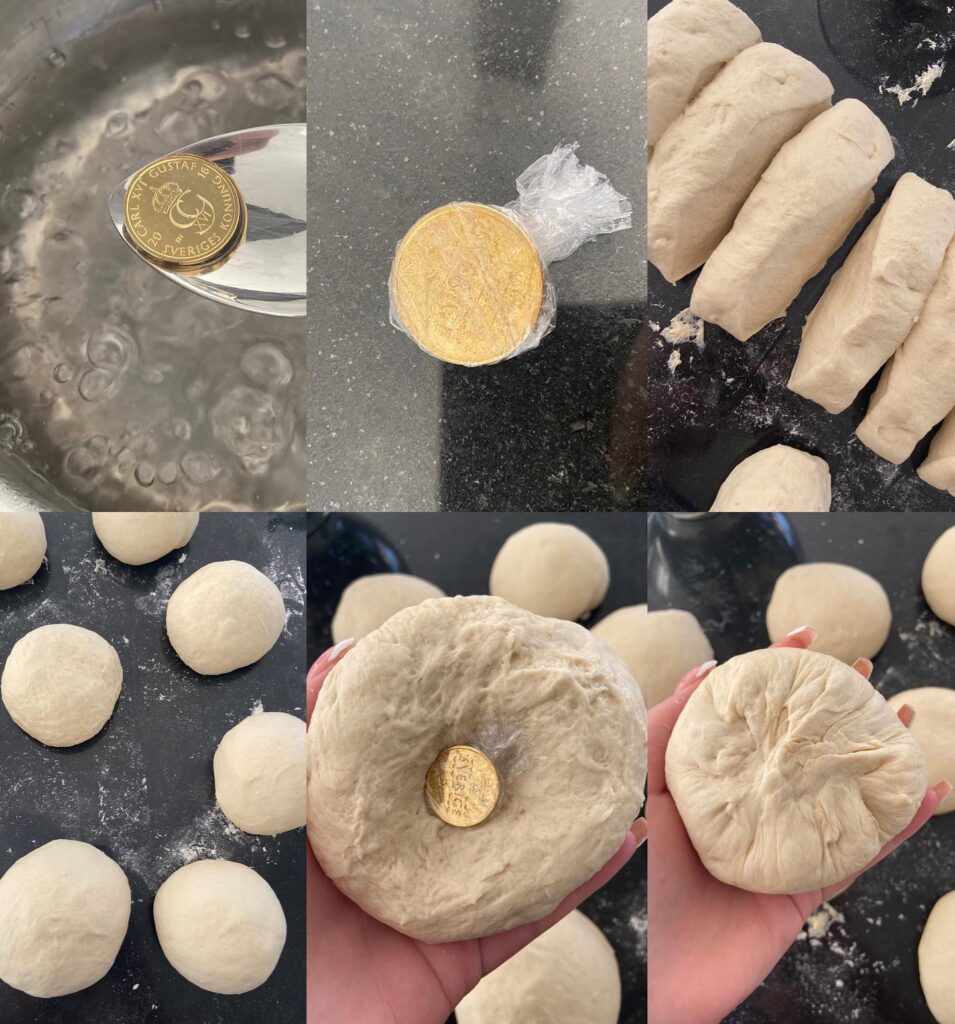 Don't forget to press the wrapped coin into one of the pieces of dough while shaping them into balls.